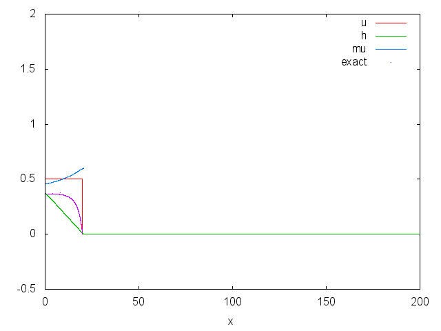 \frac{\partial }{\partial t} h \; +\; \frac{\partial }{\partial x} uh=0 \frac{\partial }{\partial t} hu + \frac{\partial }{\partial x} \dfrac{(hu)^2}{h} + \frac{\partial }{\partial x}g\dfrac{h^2}{2} = - gh \frac{\partial }{\partial x} Z-\mu(I) g h\frac{u}{|u|} + \frac{\partial }{\partial x}(\nu_e h^{3/2}\frac{\partial }{\partial x}u) over a rough inclined plane Z=-\tan \theta x with the \mu friction law \mu=\mu_0 + \frac{ \Delta \mu}{1+I_0/I} where I=\frac{5 (d_g)|u|}{2\sqrt{gh}h} is the mean inertial/ Froude / Savage number, where d_g is the grain diameter. Note that the problem is without dimension, if space is measured by H, the speeds are measured by \sqrt{g H} (see remark on t). So, there is no g and \rho in I. Note that in the fundamental papers of Pouliquen, the function \mu is different (and the value of the parameters of the friction law as well).